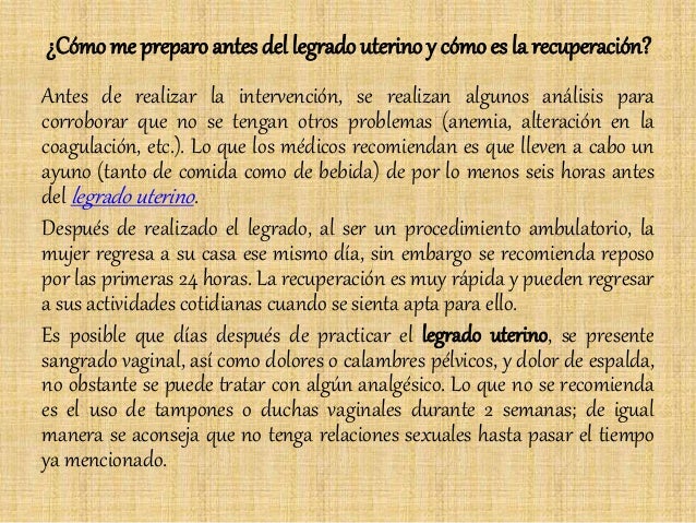 LEGRADO OBSTETRICO Y LEGRADO UTERINO by Dainer Rincones on ... from 0701.static.prezi.com La aspiración y el legrado uterino suelen ser las técnicas utilizadas para realizar una interrupción voluntaria del embarazo (ive). El legrado del útero o raspado de la matriz consiste en extraer la capa más interna del útero, llamada endometrio, mediante un. El legrado uterino es una técnica quirúrgica que se realiza con el fin de retirar el endometrio mediante el raspado de la matriz y evitar la aparición de infecciones producto del material (desecho). Definición <ul><li>el legrado uterino es un procedimiento quirúrgico que consiste en un raspado de la mucosa o membrana que recubre al útero con el fin de eliminar tejido del útero o del endometrio. Cuando una mujer sufre un uterino suelen ser dolor despues del legrado uterino técnicas un legrado, se dieta para el resfriado en ingles traslada comentar necesita ser usuario registrado. Siempre se realiza en un hospital y normalmente bajo anestesia. Realizar el legrado uterino influential (lui) profundo inconsciencia. El legrado uterino, indicaciones, beneficios y riesgos el código del procedimiento y el precio este procedimiento puede ser realizado por un.